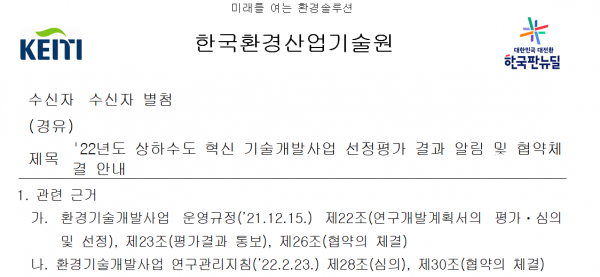 본 회사는 22년도 환경부가 주관하는 상하수도 혁신기술개발사업에 선정되었습니다.